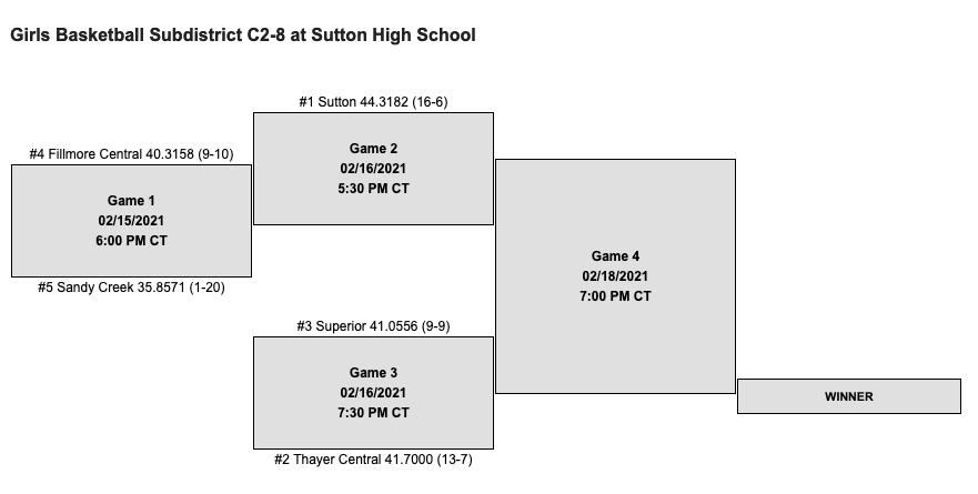 Sub district girls basketball is tonight against Sandy Creek at Sutton at 7:00 PM. All sub district games will be available on Sandy Creek's Striv: https://www.southernnebraskaconference.org/images/files/nsaa_home.html